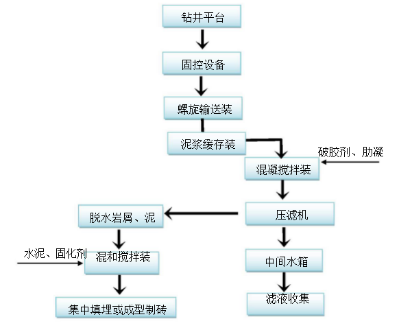 西安華揚(yáng)油氣設(shè)備有限公司此工藝主要流程為:將鉆井過程中排放的廢棄泥漿通過泥漿收集箱,用泵提升送至巖屑緩存裝置,用泵提升至破乳混凝罐,用干粉投加機(jī)定量加破乳、助凝藥?;炷河商沾呻p缸泵抽至撬裝隔膜壓濾機(jī)進(jìn)行固液分離,分離出來的泥餅由皮帶輸送機(jī)輸送出壓濾單元,濾液進(jìn)入后續(xù)凈化處理裝置。